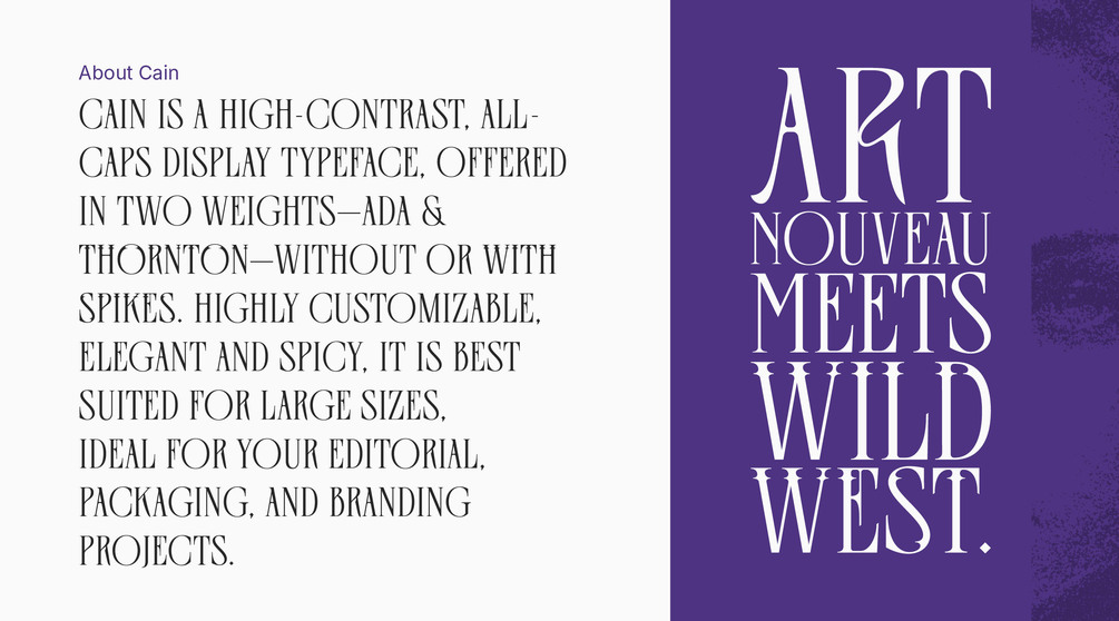 Cain is a high-contrast, all-caps display typeface, offered in two weights—Ada & Thornton—without or with spikes. Highly customizable, elegant and spicy, it is best suited for large sizes, ideal for your editorial, packaging, and branding projects.