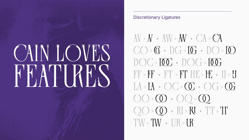 With 389 glyphs, and 17 versatile layout features Cain is supporting 38 languages.