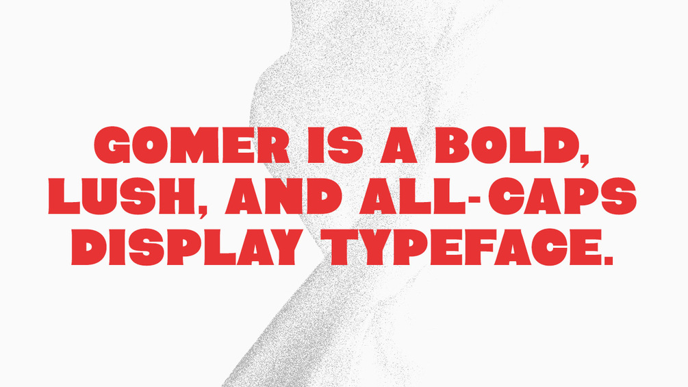 Gomer is a bold, lush, and all-caps display single-weight typeface. It's ideal for posters, album art, packaging design, and large applications. Inspired by wood printing type, its appearance conveys both strength and warmth, making it suitable for different styles.